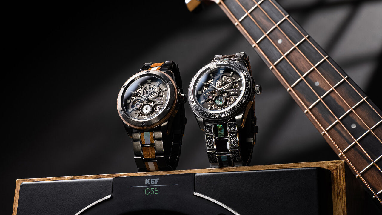 Crafted from reclaimed Taylor tonewood, these watches carry the spirit of the stage, the grit, the grain, and the soul of every song. From the silver western etched automatic to the dark koa and mother of pearl edition, each piece is a tribute to musicians who pour themselves into their craft.