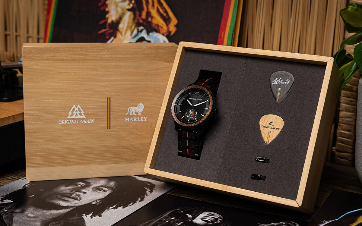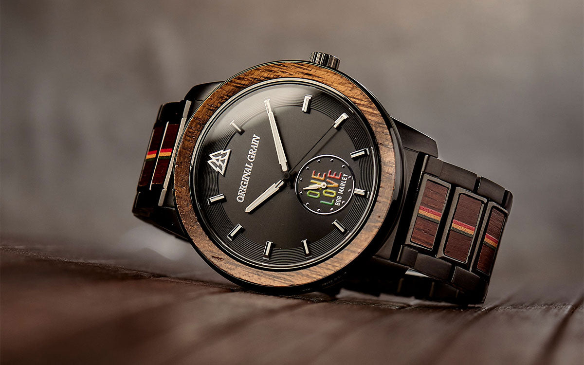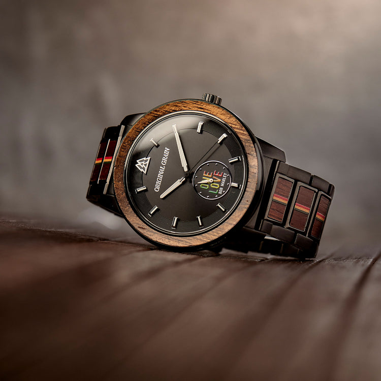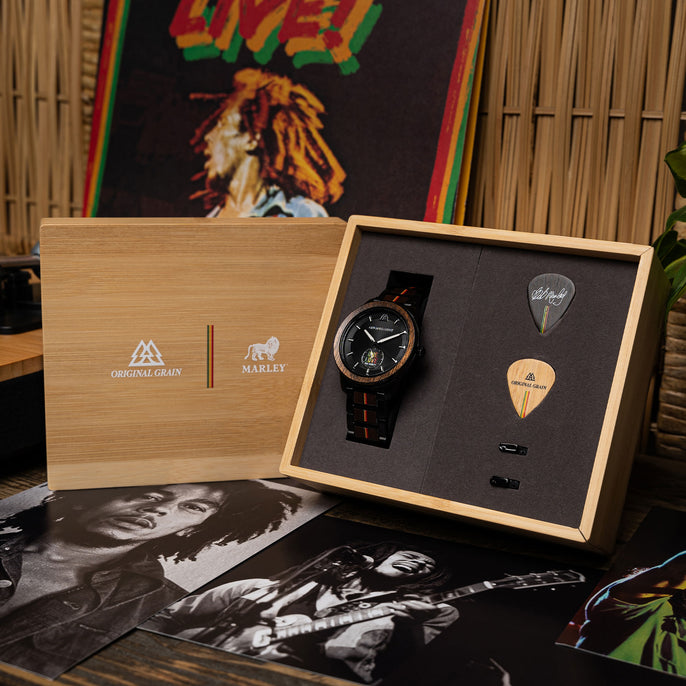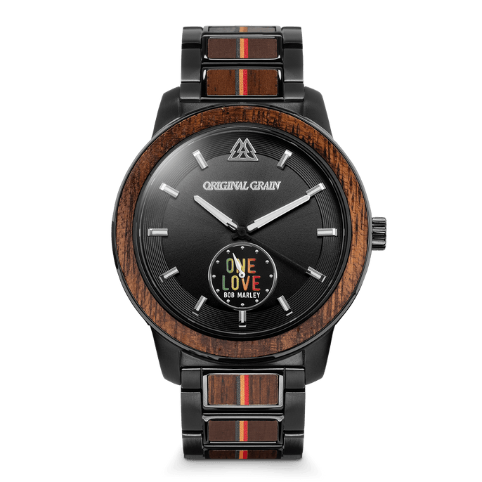 The Bob Marley collection of timepieces is inlaid with Bamboo & Palm Tree wood from Jamaica, that embodies his legacy, uniting the world with the universal language of One Love.