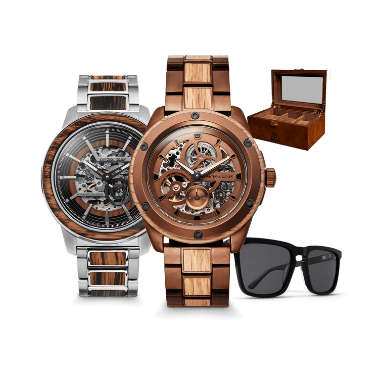 You’ll get two of our top-selling whiskey watches, a pair of sunglasses crafted from reclaimed whiskey barrels, and a collector’s box to showcase your new timepieces.