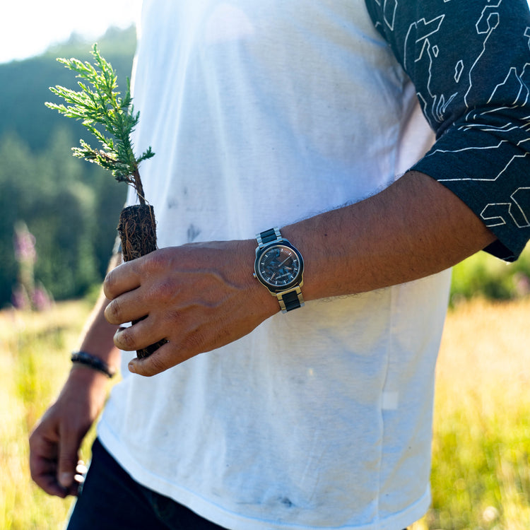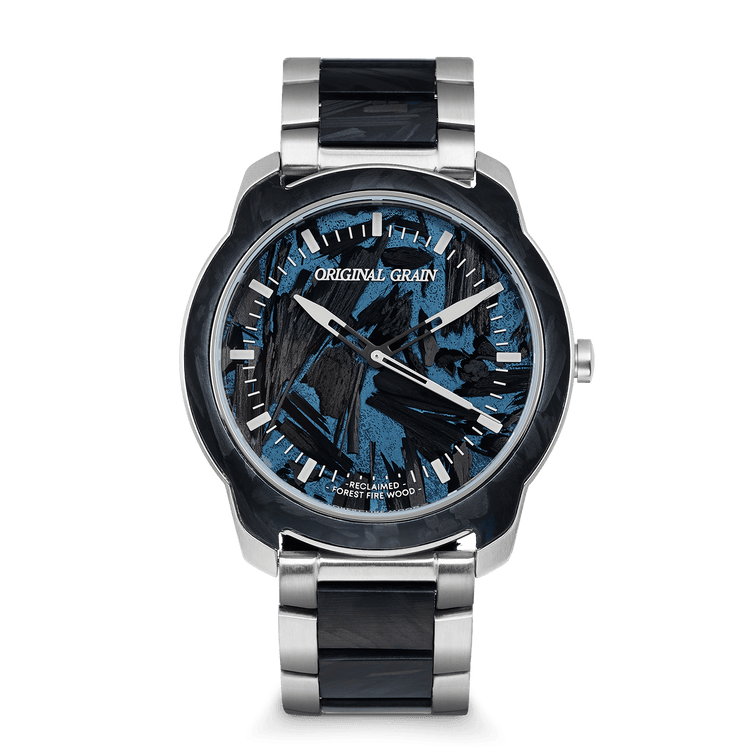 Made with reclaimed forest fire wood, this watch was designed to bring awareness to the reality of forest fires happening throughout the U.S.and globally. Many fires can be prevented through wildfire safety, This collection is to raise awareness around global climate change and fire prevention