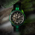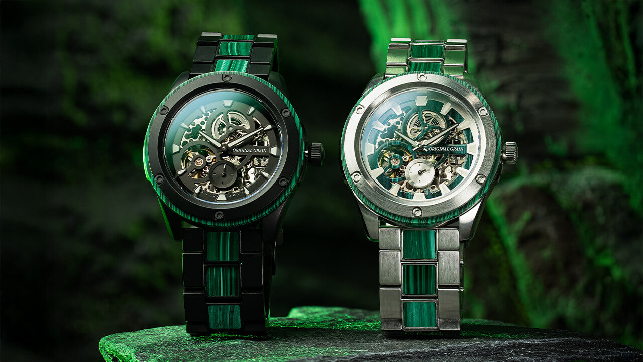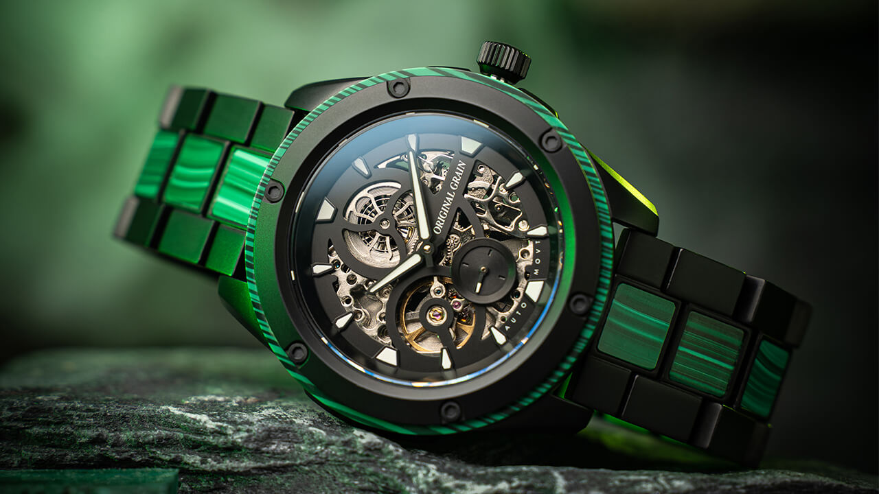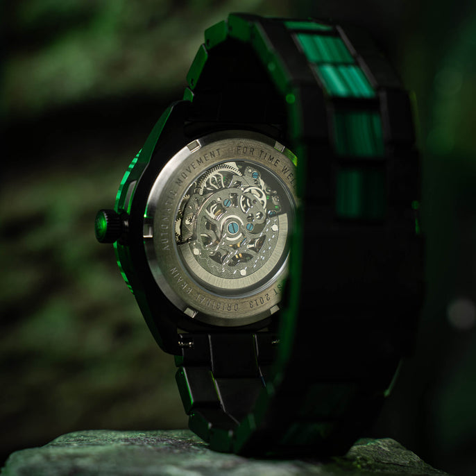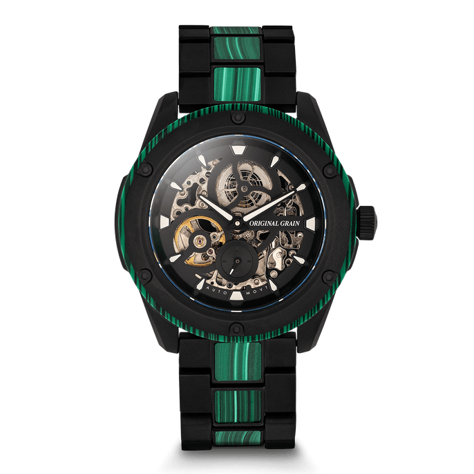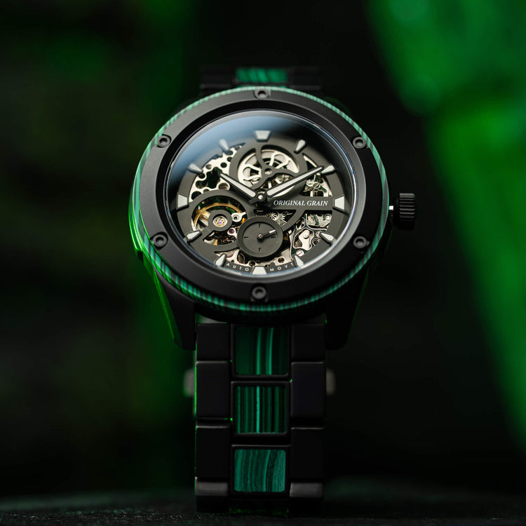 Featuring a highly accurate ST1701 automatic movement with a skeleton dial, 40-hour power reserve, and 20 jewels, as well as an ultra-durable sapphire crystal glass cover. Made with matte black steel and Ancient Malachite Stone. A statement piece all on its own!