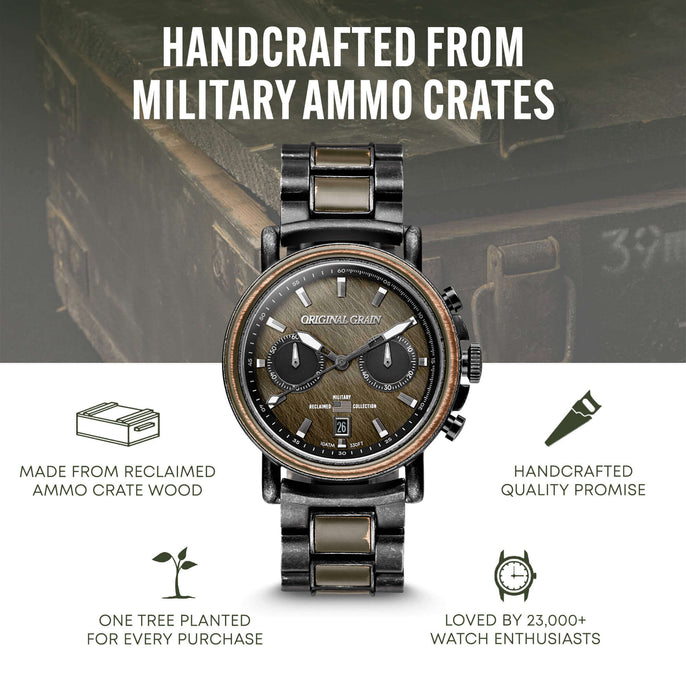 Inspired by the bravery and valor of all who have served. The Military Collection features Reclaimed wood from actual ammunition crates – the crates that safely transported ammo to front line troops. Genuine gear, used by heroes of days past.