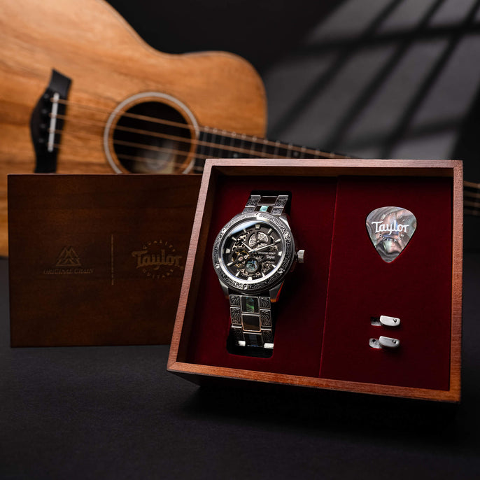 Original Grain and Taylor Guitars are coming together, to bring you San Diego craftsmanship at its finest with a limited edition collection of watches made with reclaimed Urban Ash and Ironbark, Hawaiian Koa, and Cameroon Ebony woods, left over from Taylor’s manufacturing process. This limited series has created one of a kind timepieces that will be cherished forever.