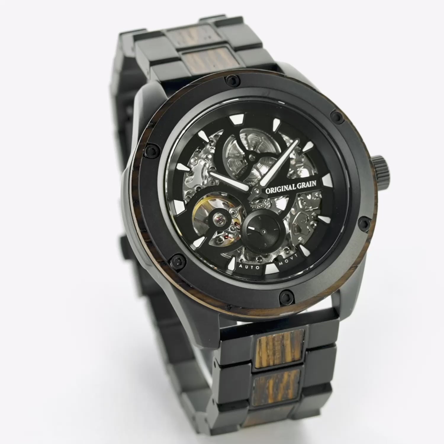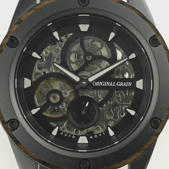 Featuring a highly accurate ST1701 automatic movement with a skeleton dial, 40-hour power reserve, and 20 jewels, as well as an ultra-durable sapphire crystal glass cover. Made with matte black steel and charred Oak reclaimed Whiskey Barrels. A statement piece all on its own!