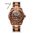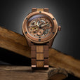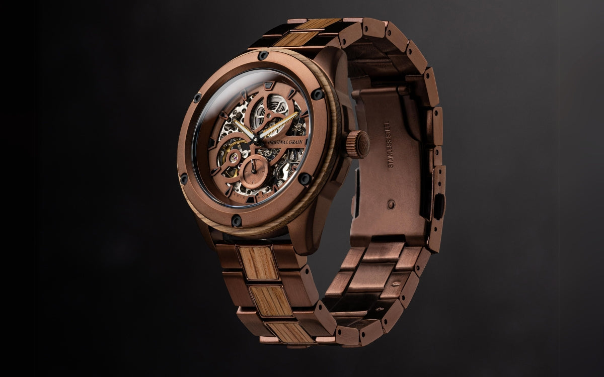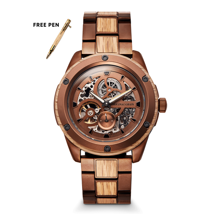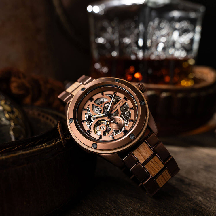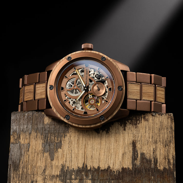 Featuring a highly accurate ST1701 automatic movement with a skeleton dial, 40-hour power reserve, and 20 jewels, as well as an ultra-durable sapphire crystal glass cover. Made with a finely brushed espresso plating unique to Original Grain, and reclaimed natural Oak whiskey barrels.